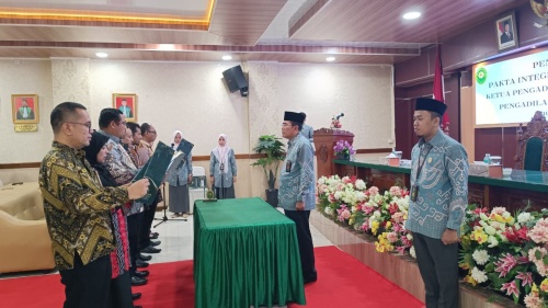 Selanjutnya, dilakukan pembacaan Pakta Integritas di hadapan Ketua PTA Pekanbaru yang dipandu oleh Ketua Pengadilan Agama Ujung Tanjung Muhlis, S.H.I., M.H., dan diikuti oleh seluruh Ketua Pengadilan Agama dalam wilayah hukum PTA Pekanbaru. Pakta Integritas merupakan komitmen bersama untuk menjaga integritas, profesionalitas, serta meningkatkan kinerja dalam pelaksanaan tugas dan fungsi peradilan.